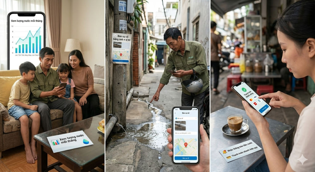 - Phản hồi sự cố tức thì: Khách hàng có thể báo cáo đường ống vỡ hoặc nước đục bằng cách gửi hình ảnh và vị trí GPS trực tiếp qua App.